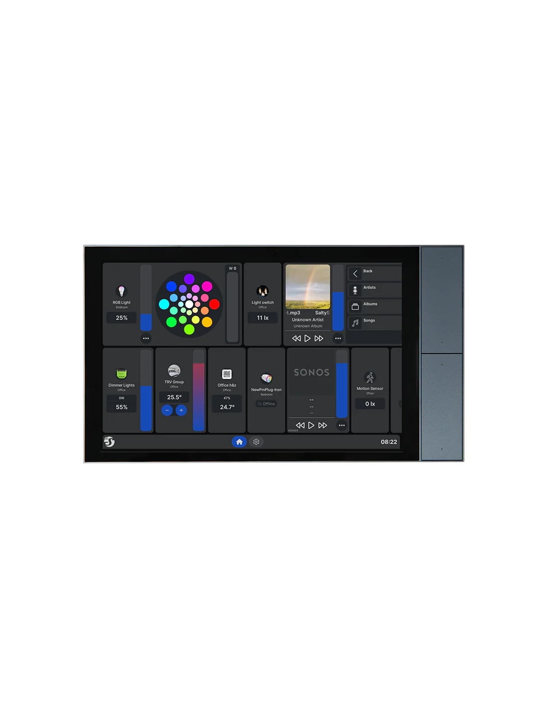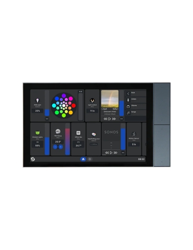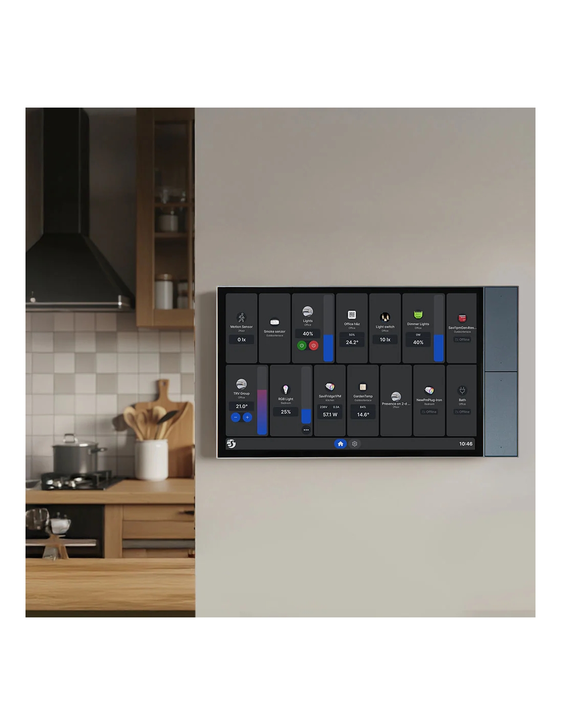 Panel de control inteligente para el hogar con pantalla táctil de 10.1", relés integrados y cuatro botones personalizables. Se instala en una caja de conexiones de pared estándar y te ofrece un control total y sencillo de tus dispositivos Shelly, ideal para casas, apartamentos, hoteles y espacios comerciales.